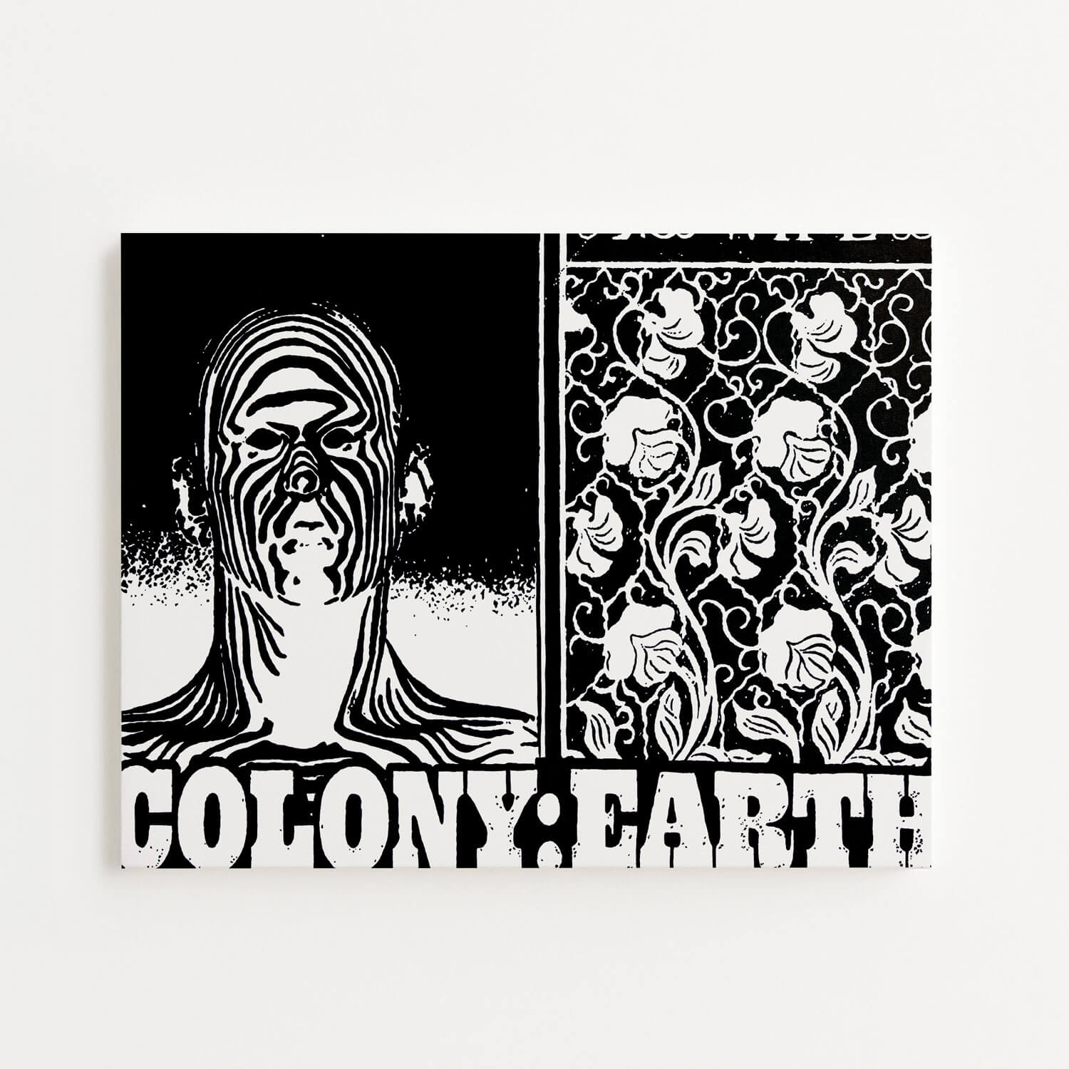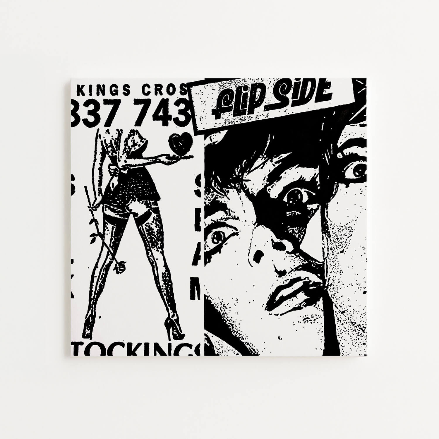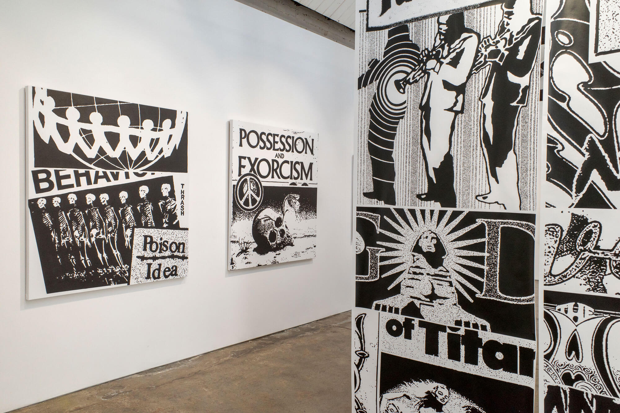 James Bourbon's new collage-based paintings excavate the forgotten debris of twentieth-century mass culture. Working in stark black and white, he reconstructs fragments from old advertisements, propaganda leaflets, and discarded print material. His traditional painting techniques mirror xerox reproduction, transmuting perceived trash into new mythologies.